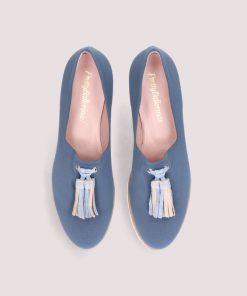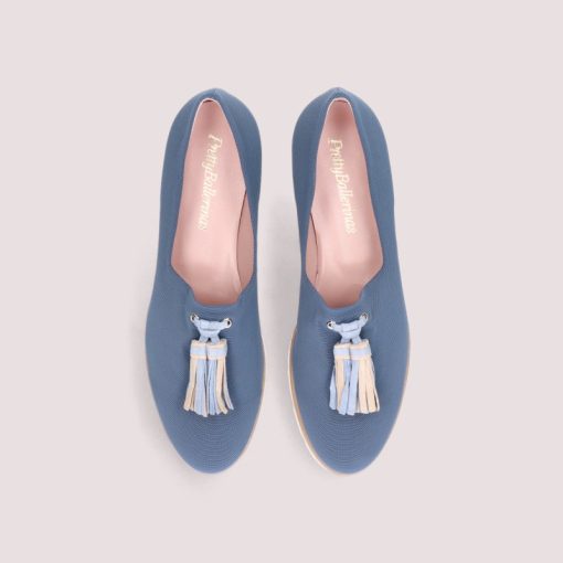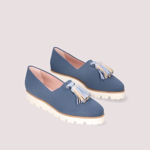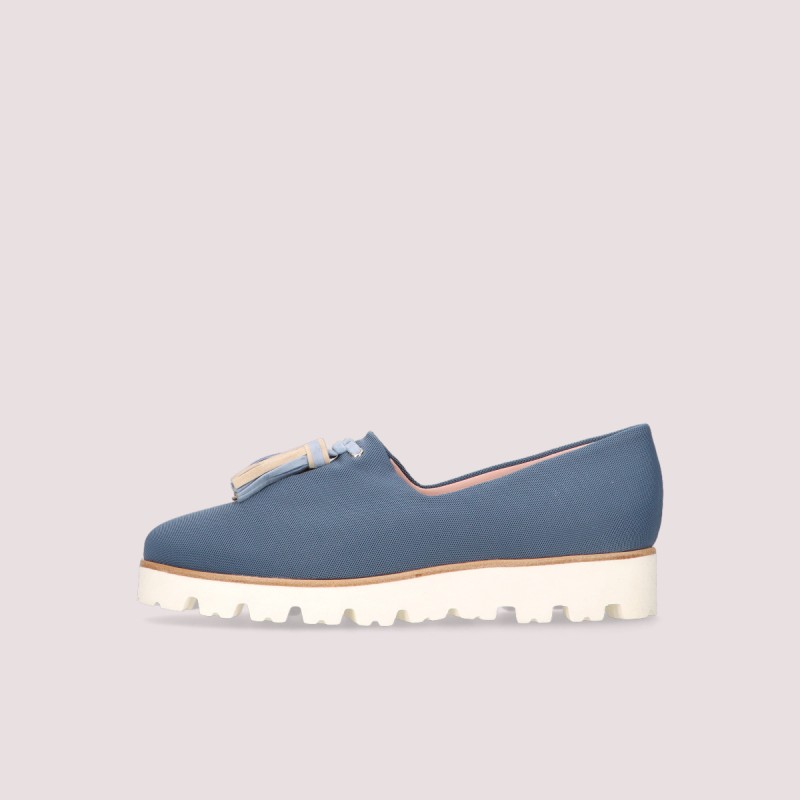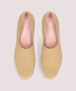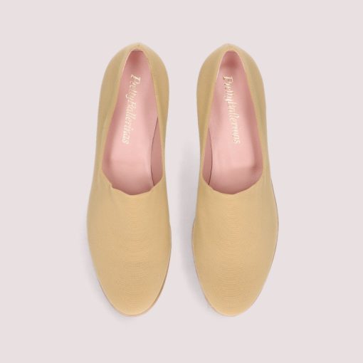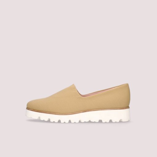 Our Charlize, a loafer with elevated light weigh sole in elastic tan fabric.