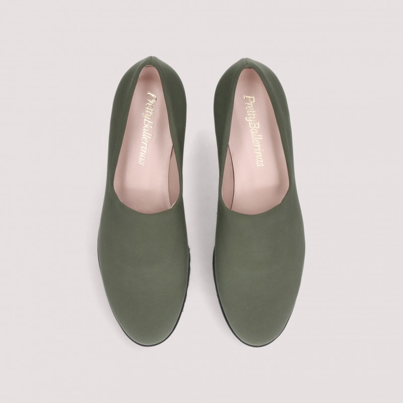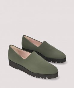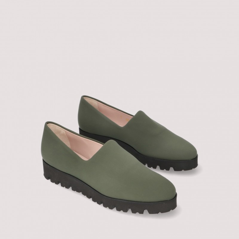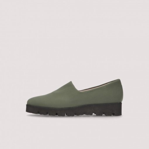 Loafer Charlize in water resistant olive green elastic fabric. Light black sole. For the walkers and travelers.