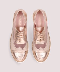 Lace up oxford in Nude and gold leather, mesh detail with a very light white sole.