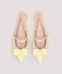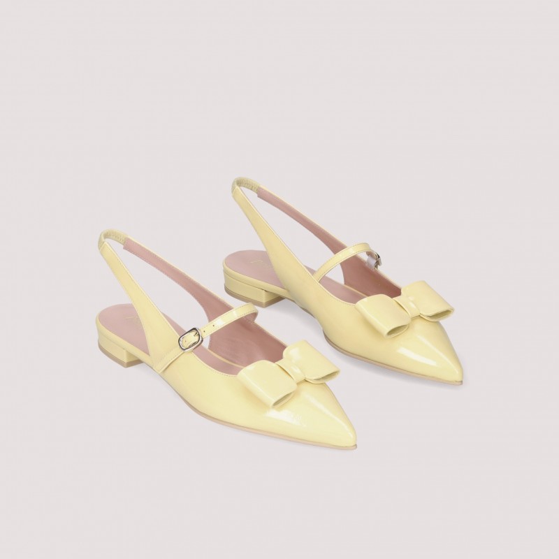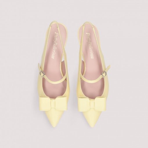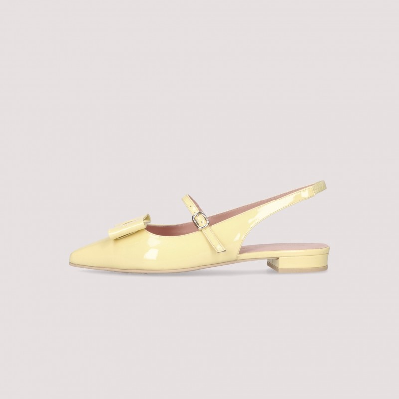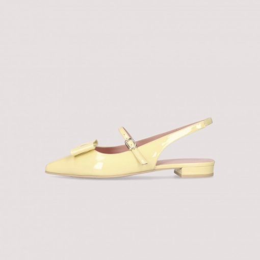 Pointed sling back ballerina Clementine with 1/2 inch heel in lemon yellow patent leather, Mary Jane strap and tie bow