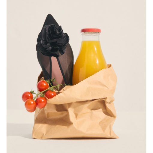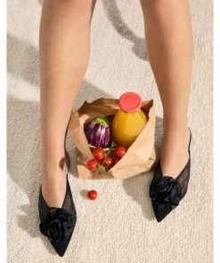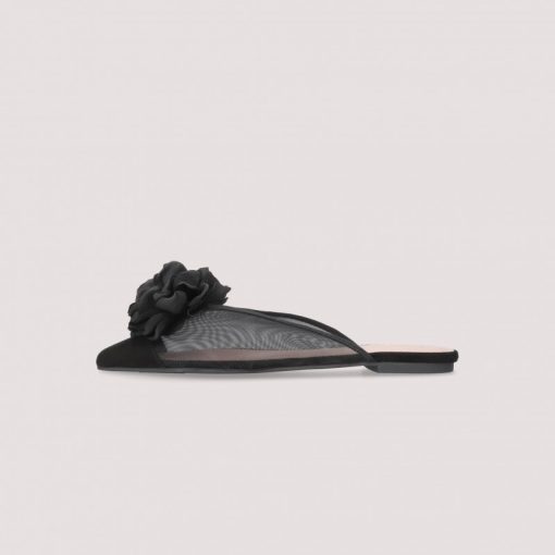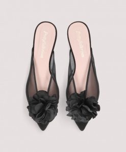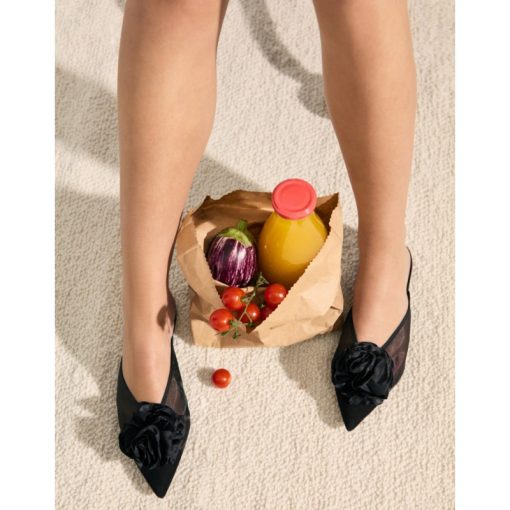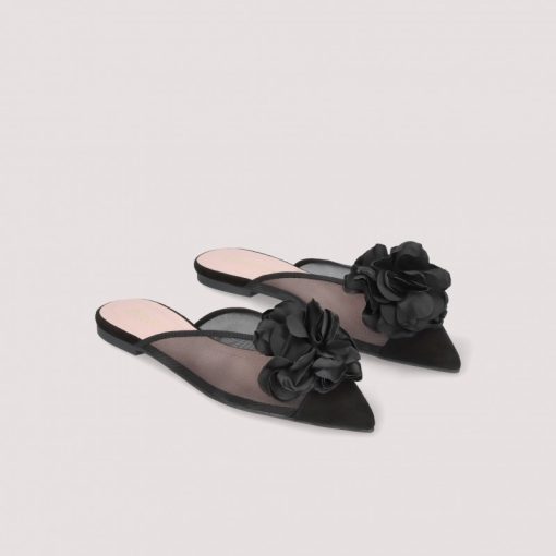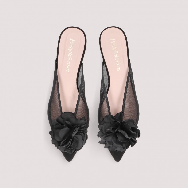 Mule Ella in black mesh with oversized black satin flower.
