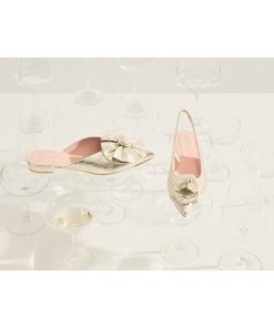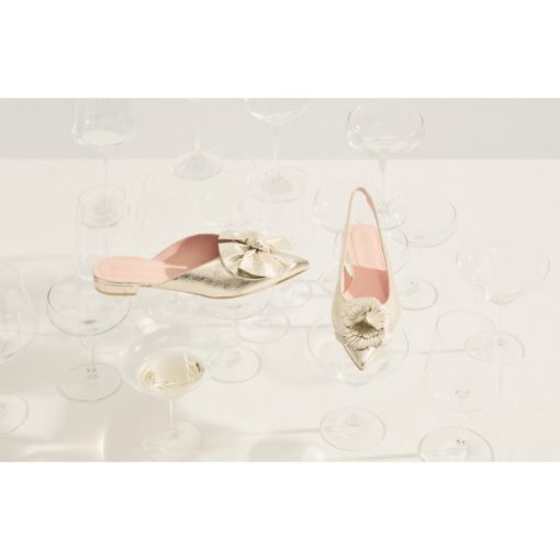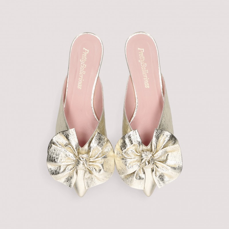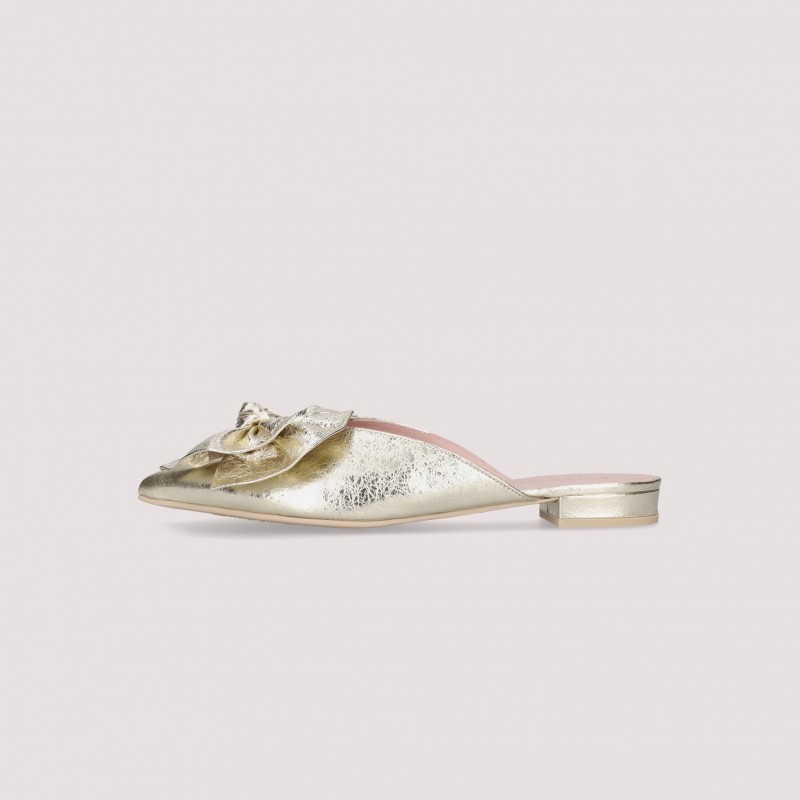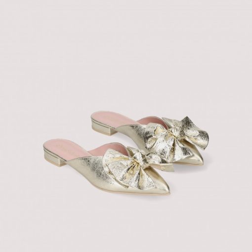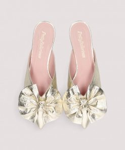 Mule Clementine in soft champagne gold metallic leather with oversized handmade bow detail.
