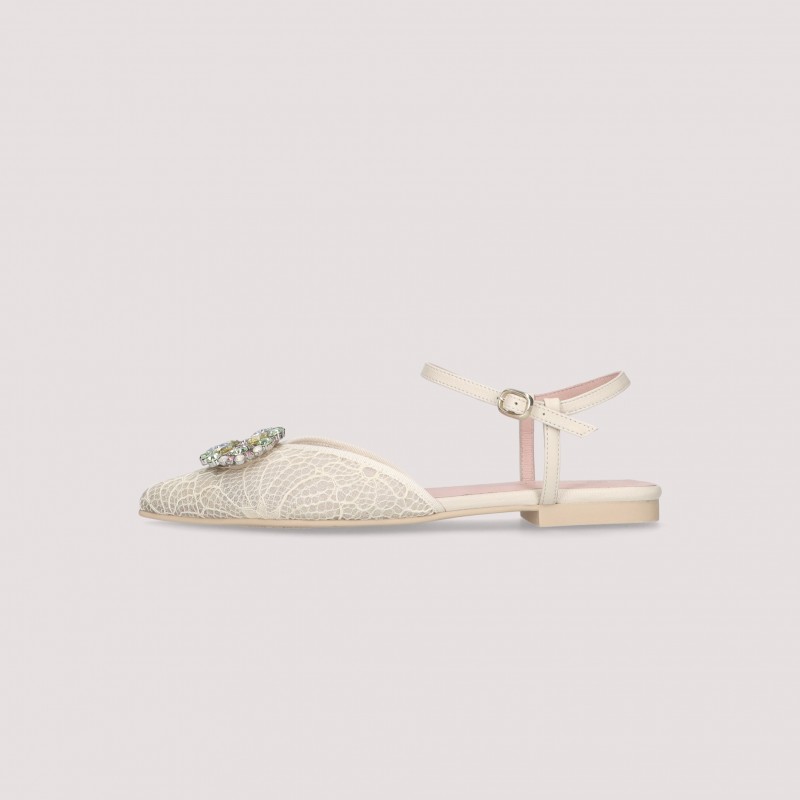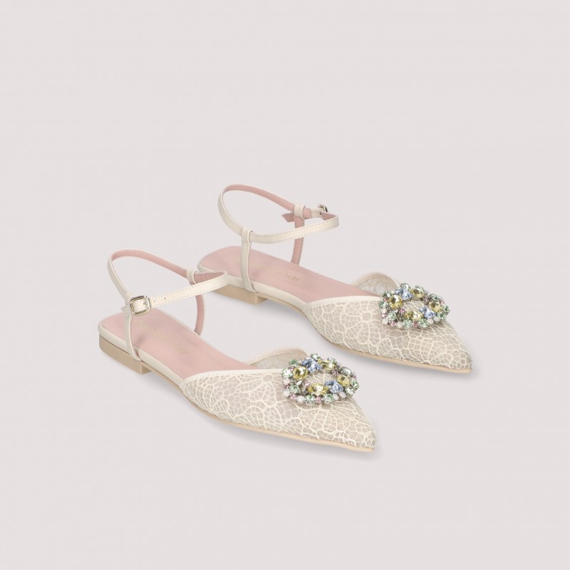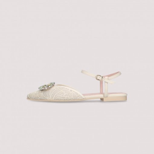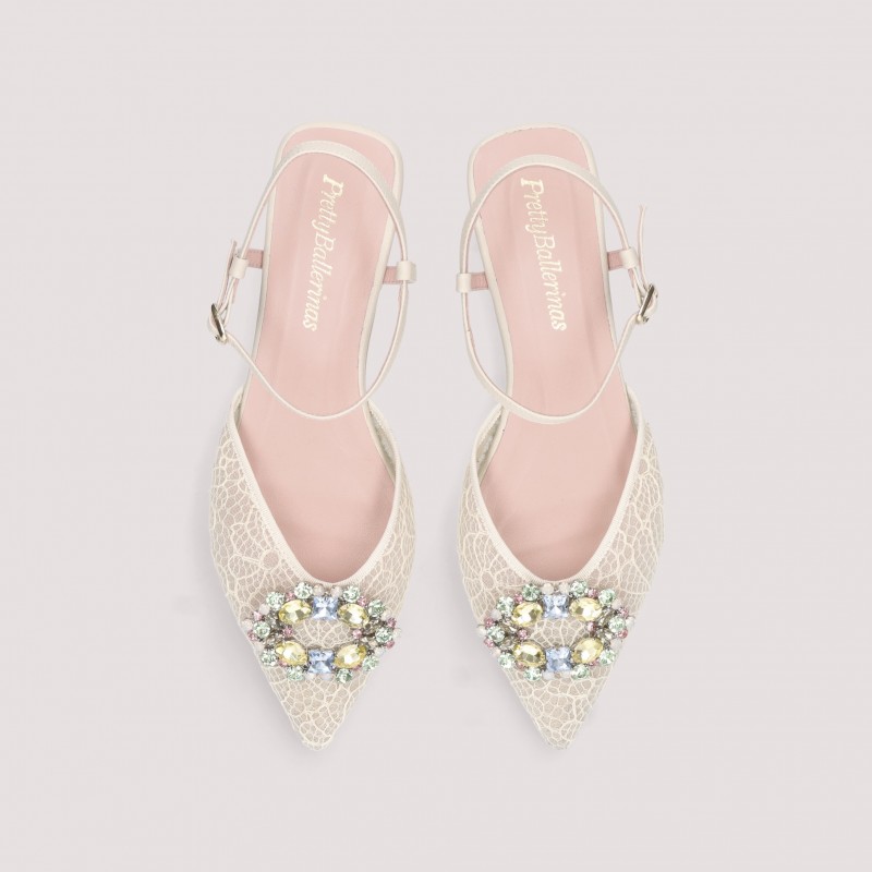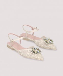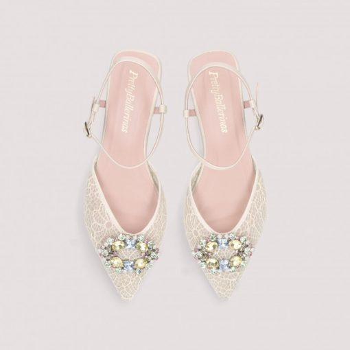 Ella slingback in Ivory mesh with embroidered lace and an elegant Swarovski brooch. Leather straps and gold buckle.