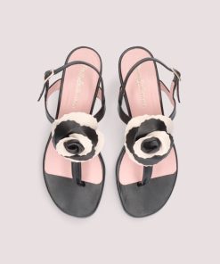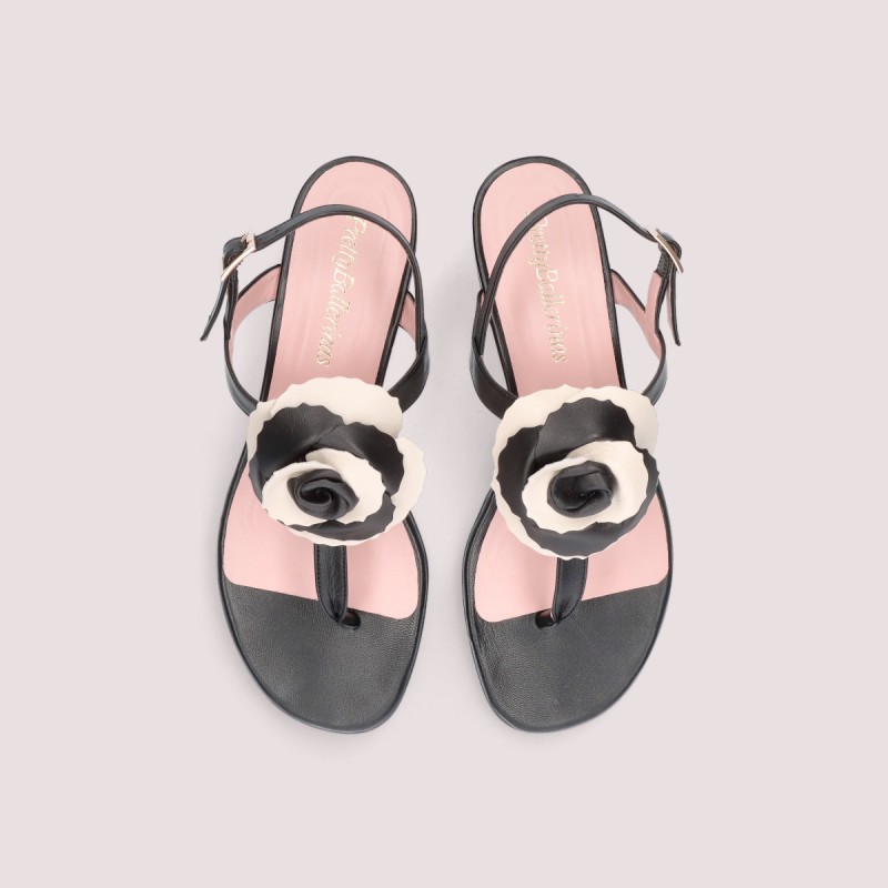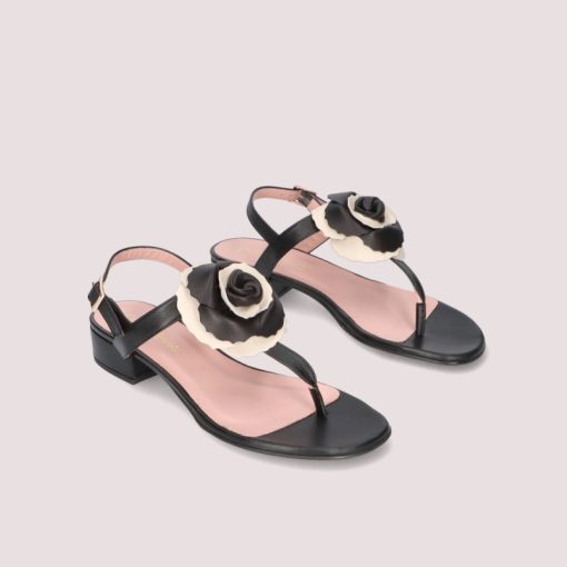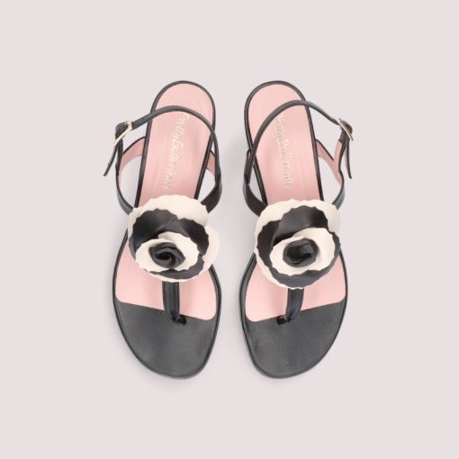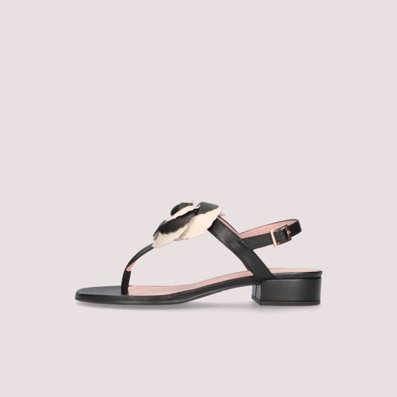 Lulu is our 1 inch heel sandal. Black soft leather with ivory and black oversized flower. A summer classic