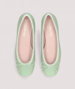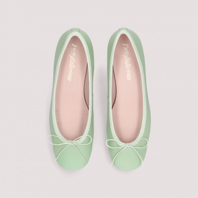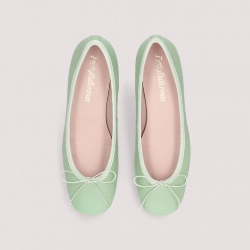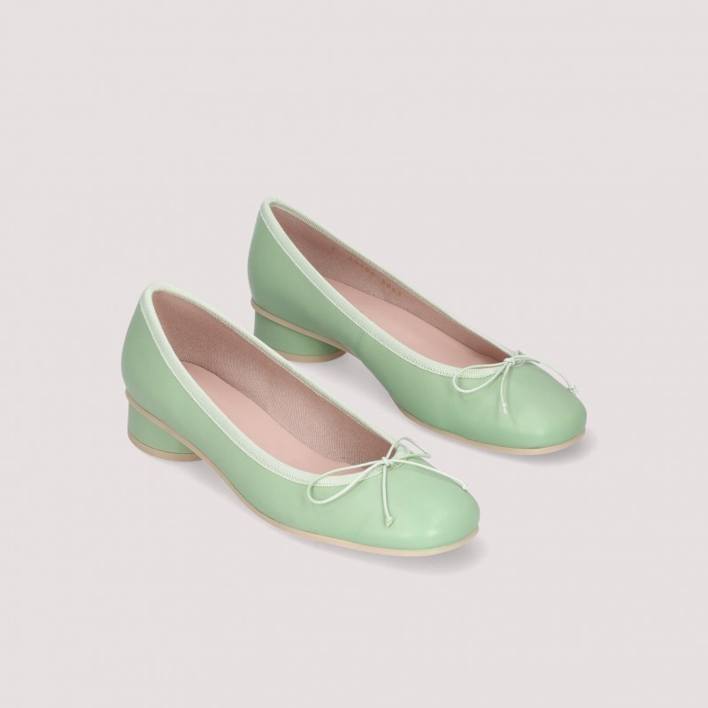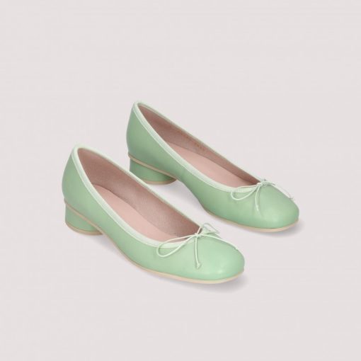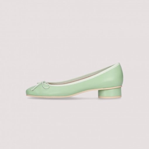 Squared toe ballerina Odette with 1.5 inch rounded heel in soft mint green leather.