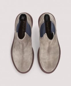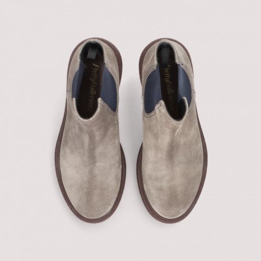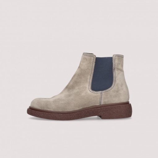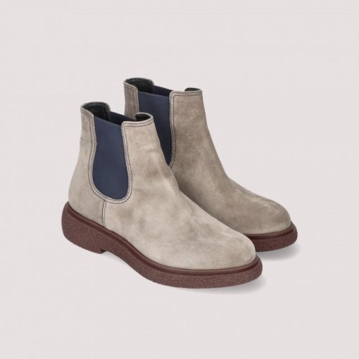 Boot Pat in taupe suede and navy elastics with 1 inch rubber sole.