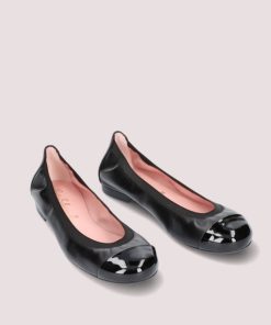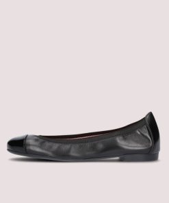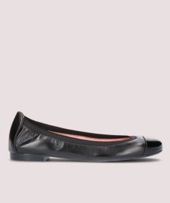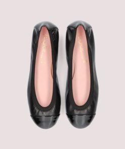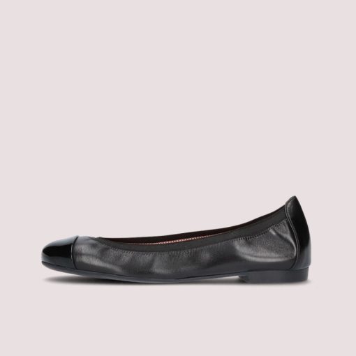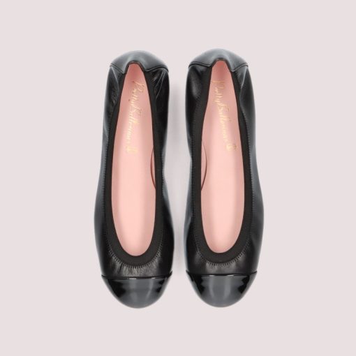 Bendy ballerina with a flexible rubber sole. Black soft leather with black patent toe cap. . Runs small, we suggest you to buy 1/2 size up
